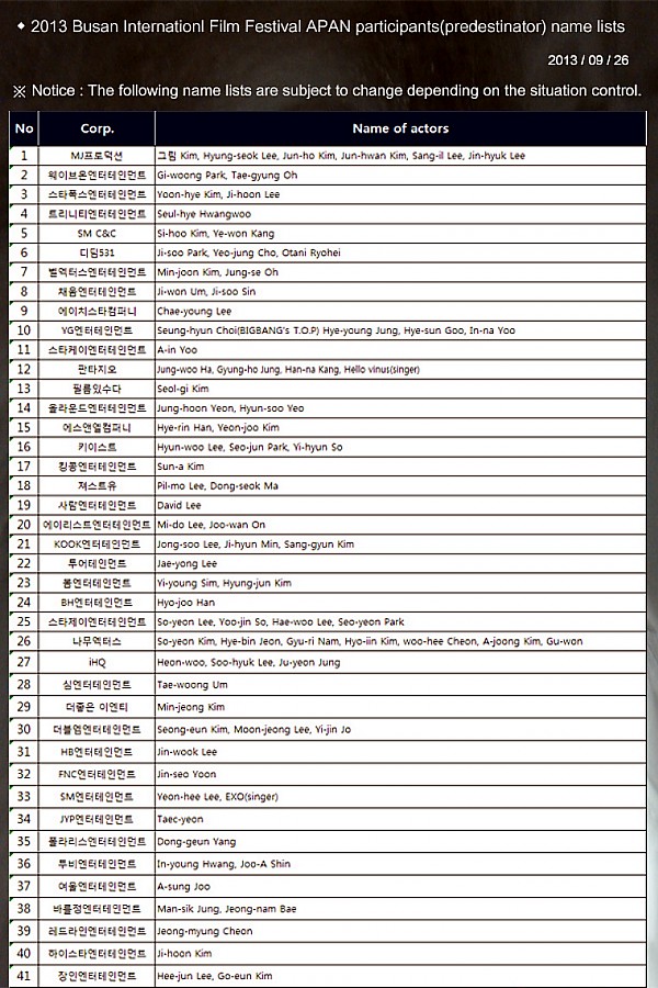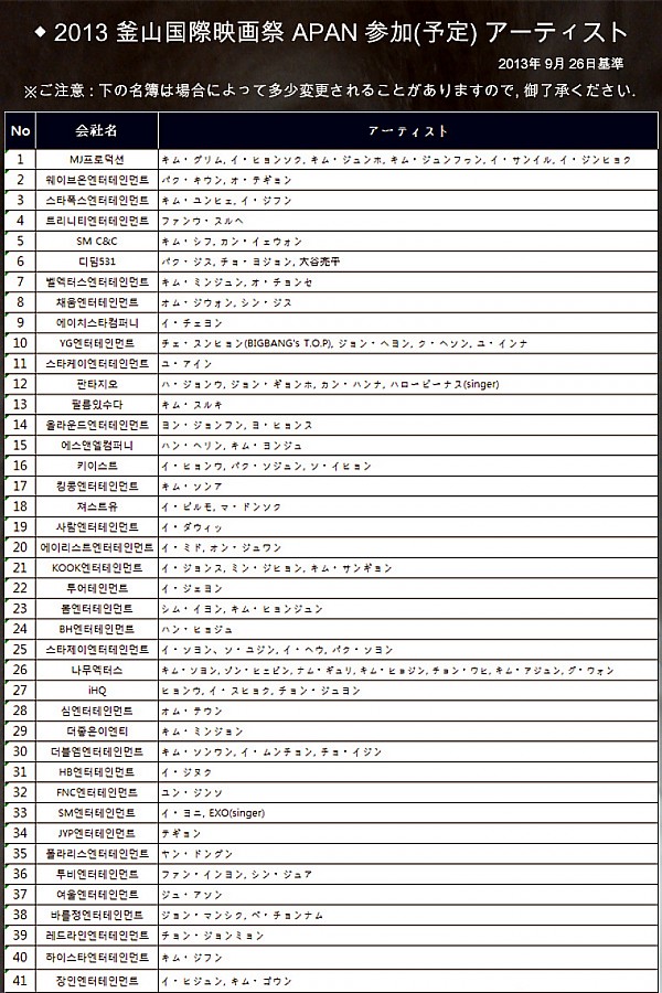2013 부산국제영화제(BIFF) APAN 참석(예정)자 명단 페이지 정보 작성자 연매협 작성일14-08-27 11:47 조회11,586회 본문 위의 명단은 상황에 따라 변경될 수 있으며, 확정된 명단이 아님을 알려드립니다. 이전글 다음글 목록