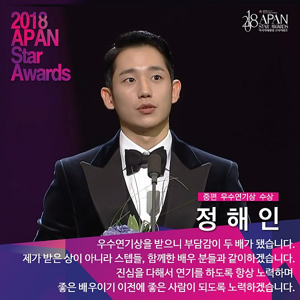 '2018 APAN Star Awards' 중편드라마 남자 우수연기상 정해인 페이지 정보 작성자 연매협 작성일18-10-26 14:07 조회11,795회 본문 ▲ 중편드라마 남자 우수연기상 정해인(JTBC '밥 잘 사주는 예쁜 누나') 이전글 다음글 목록