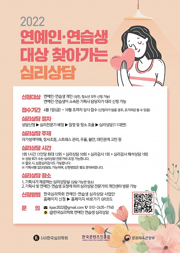 한국콘텐츠진흥원과 (사)한국심리학회에서 <2022 연예인·연습생 대상 찾아가는 심리상담> 사업을 진행하고 있습니다. 아래의 내용 및 첨부파일을 살펴보시고 많은 참여 부탁드립니다.